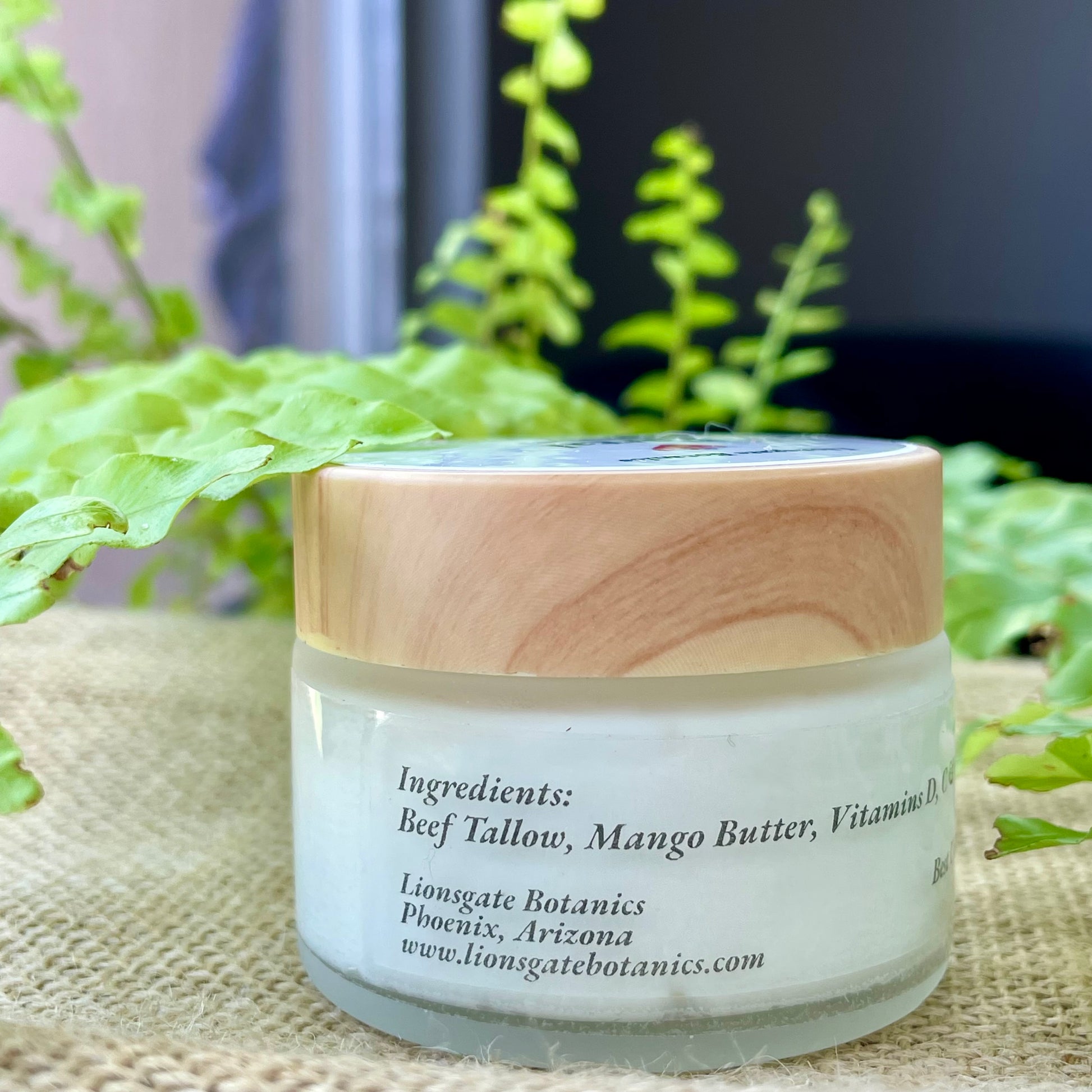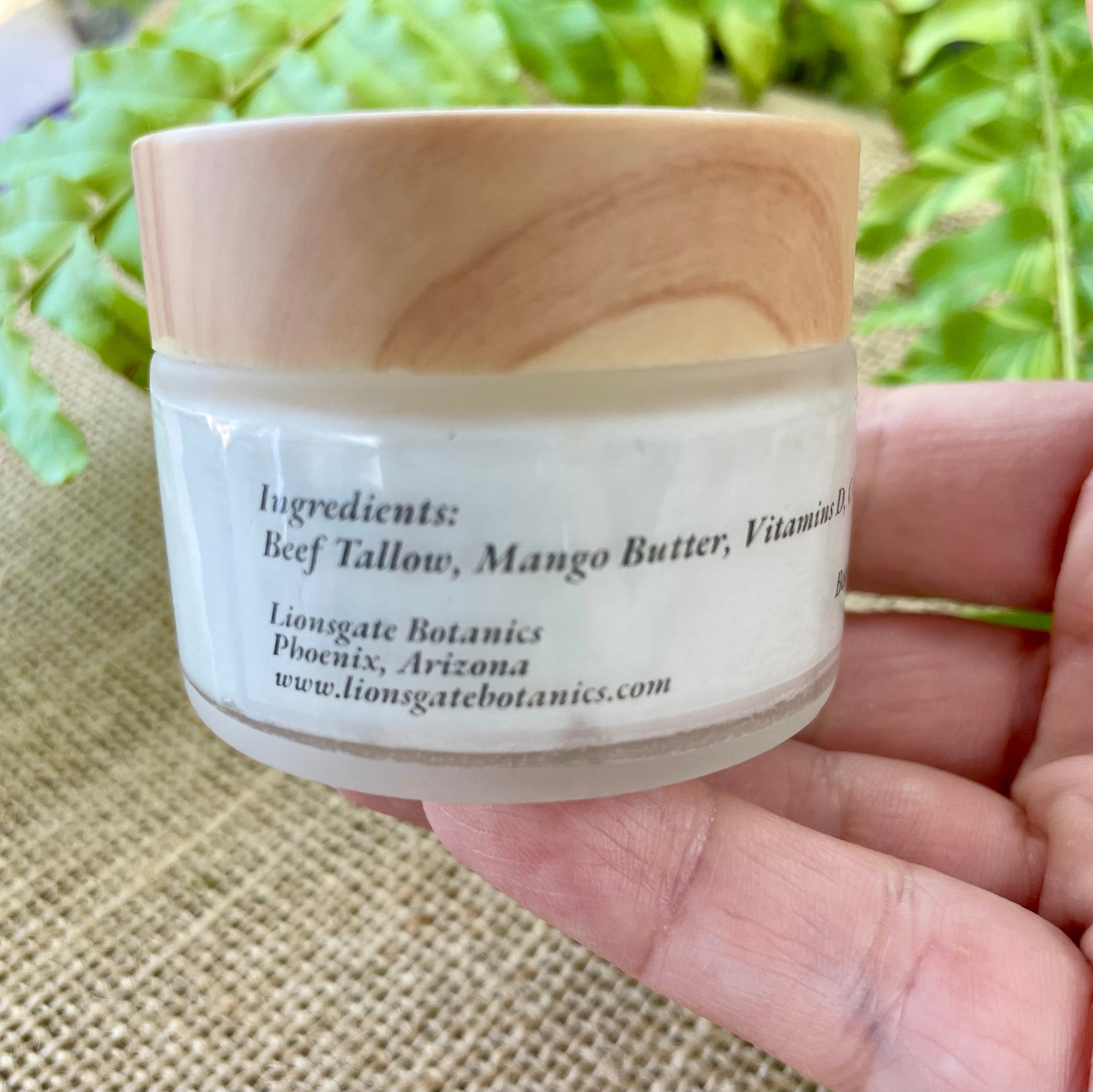 Ingredients: Grass-fed Beef Tallow, Organic Mango Butter, Vitamins E, D & C.