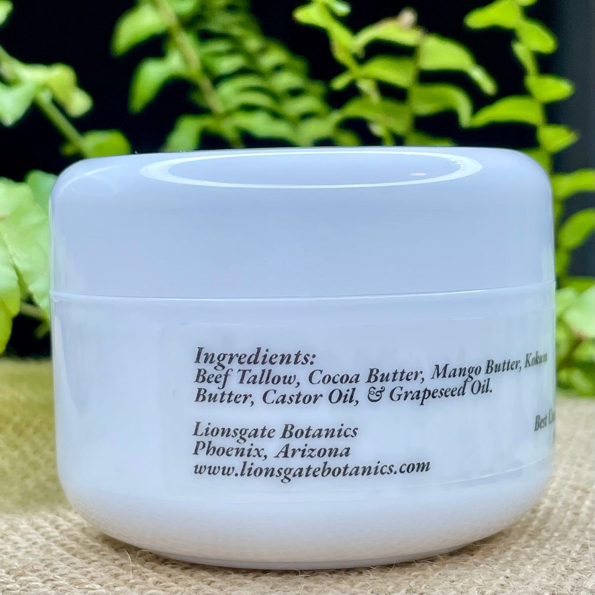 Ingredients: Grass-fed Beef Tallow, Organic Cocoa Butter, Organic Mango Butter, Unrefined Kokum Butter, Organic Cold-Pressed Castor Oil, & Organic Cold-Pressed Grapeseed Oil.